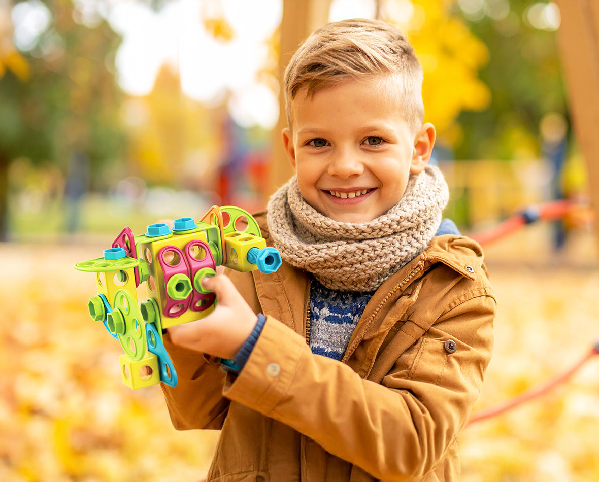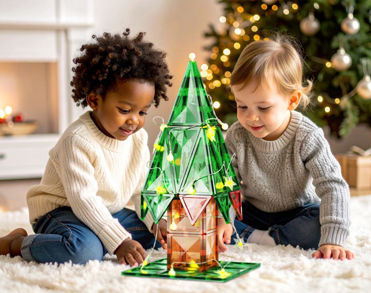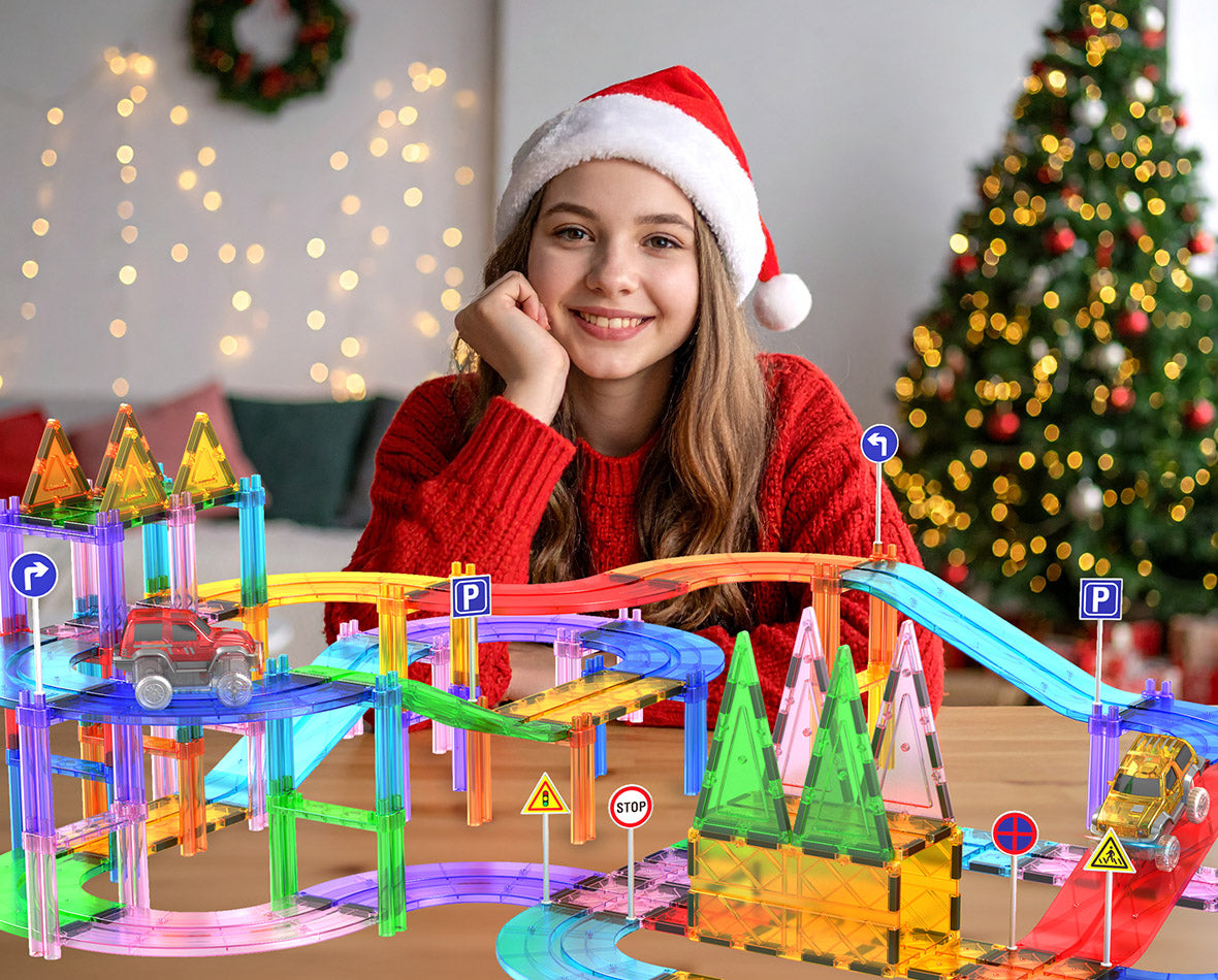 Magnetic tile construction toy set with crane, dump truck, excavator, road tiles, and buildable worksite