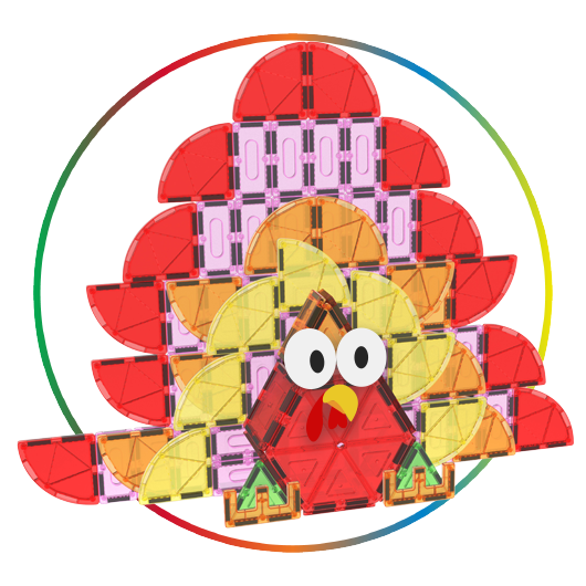 Colorful magnetic tiles assembled into a towering castle structure, showcasing vibrant hues and geometric shapes.