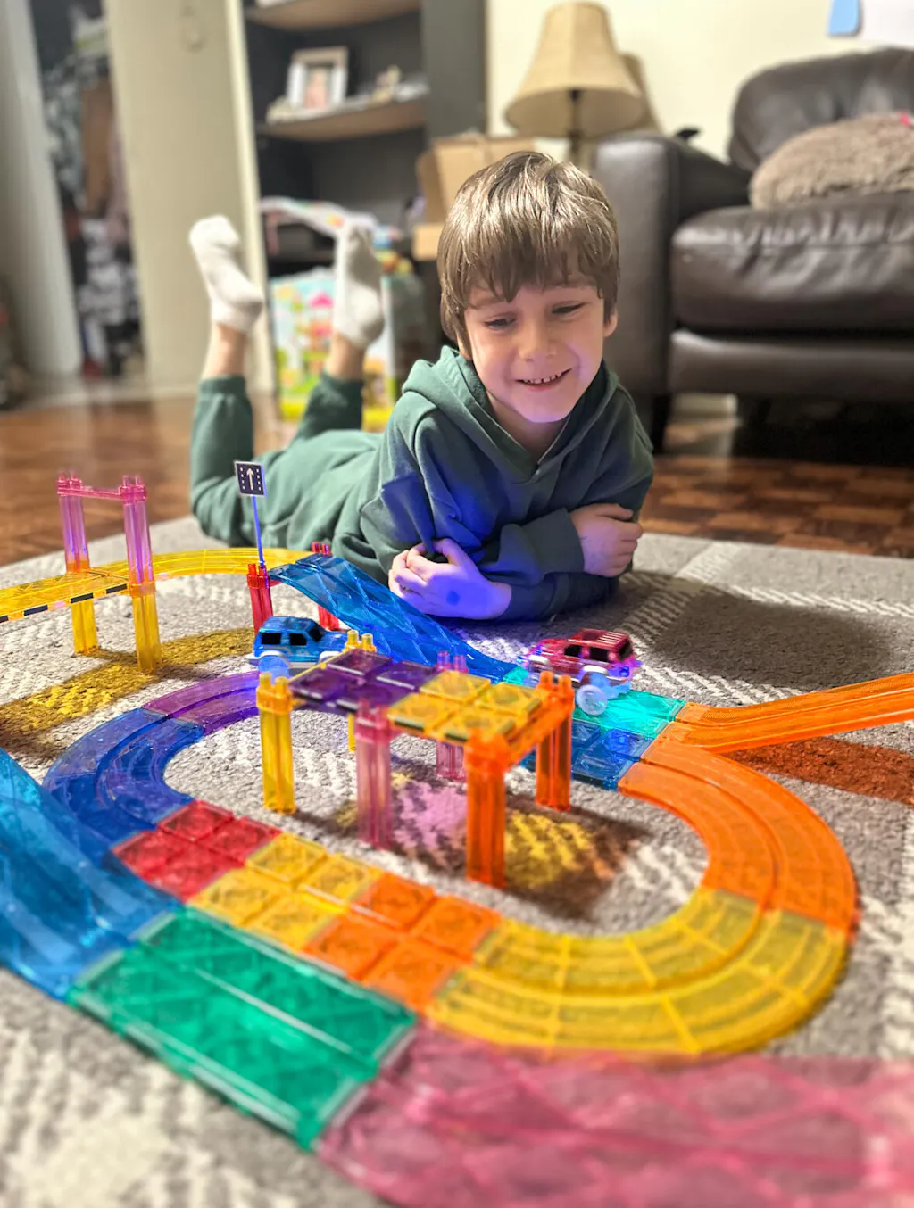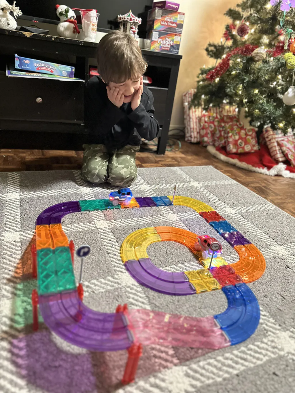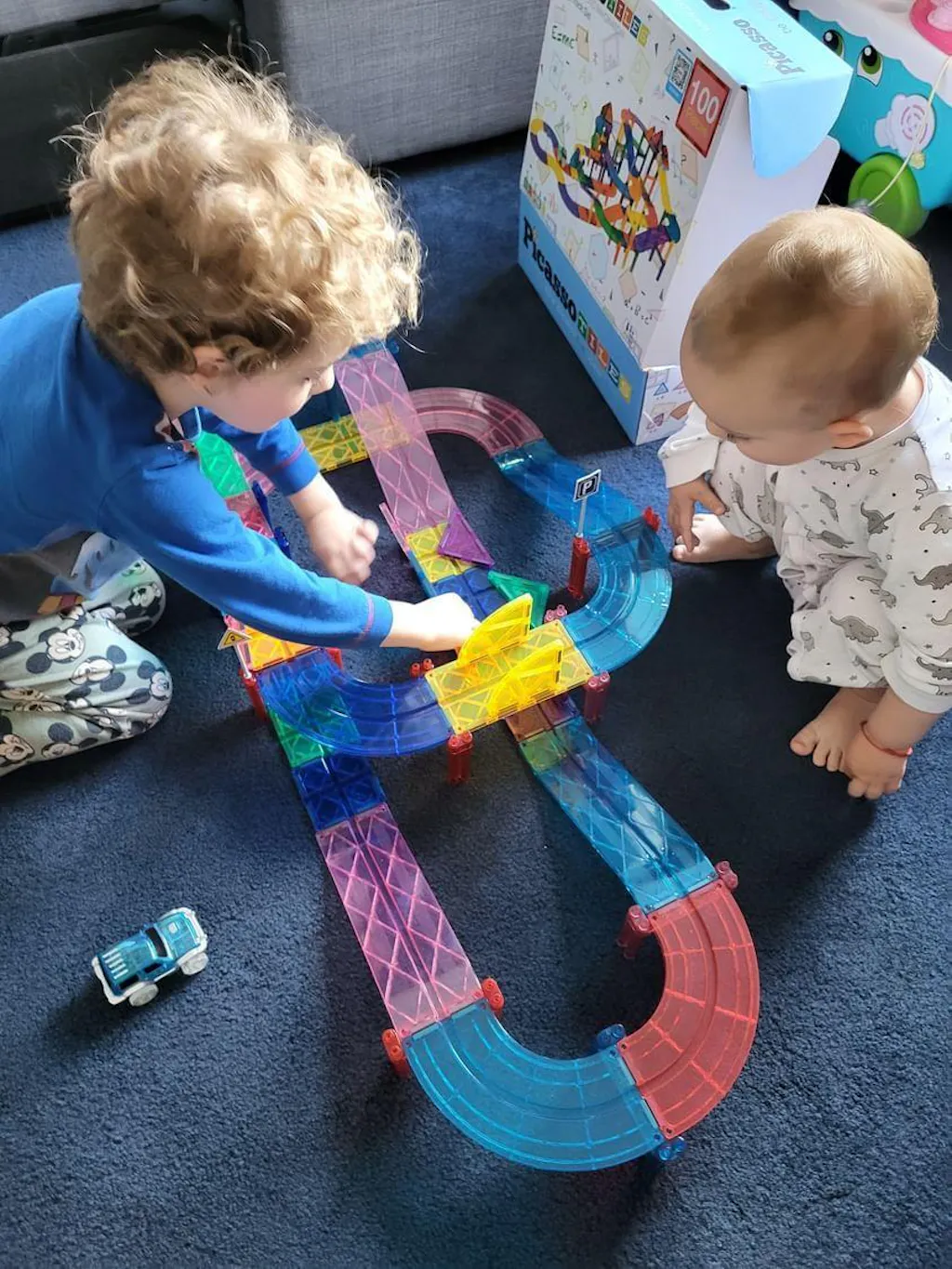 PicassoTiles Magnetic Race Track Set (PTR100) with LED Cars includes 100 snap-together tiles, ramps, columns, and 2 light-up race cars. Kids build multi-layered 3D tracks, race through curves and slopes, and develop fine motor skills, spatial logic, and STEM creativity through play.