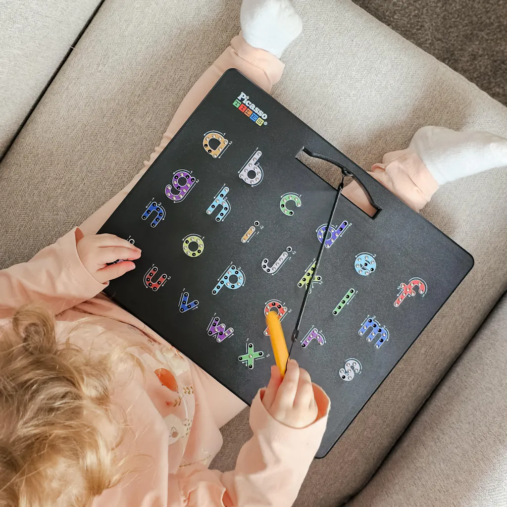 PicassoTiles magnetic alphabet board (PTB04‑BLK) features lowercase tracing and freestyle drawing to support early reading, writing, and creative expression. Kids build language skills and confidence through hands-on magnet tiles play at home or in the classroom.