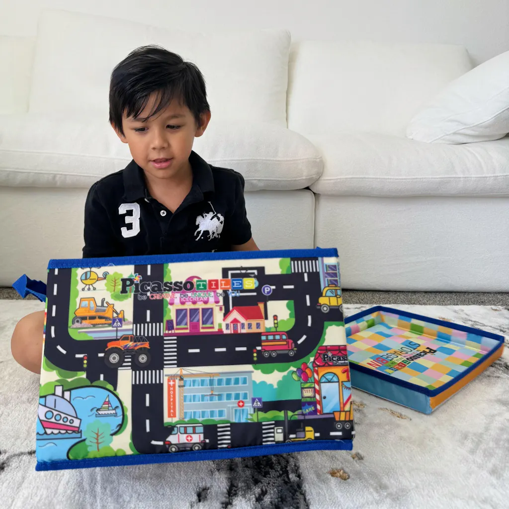 PicassoTiles Magnet Tile Toy Organizer: City Theme Storage Bin with Lid & Handles