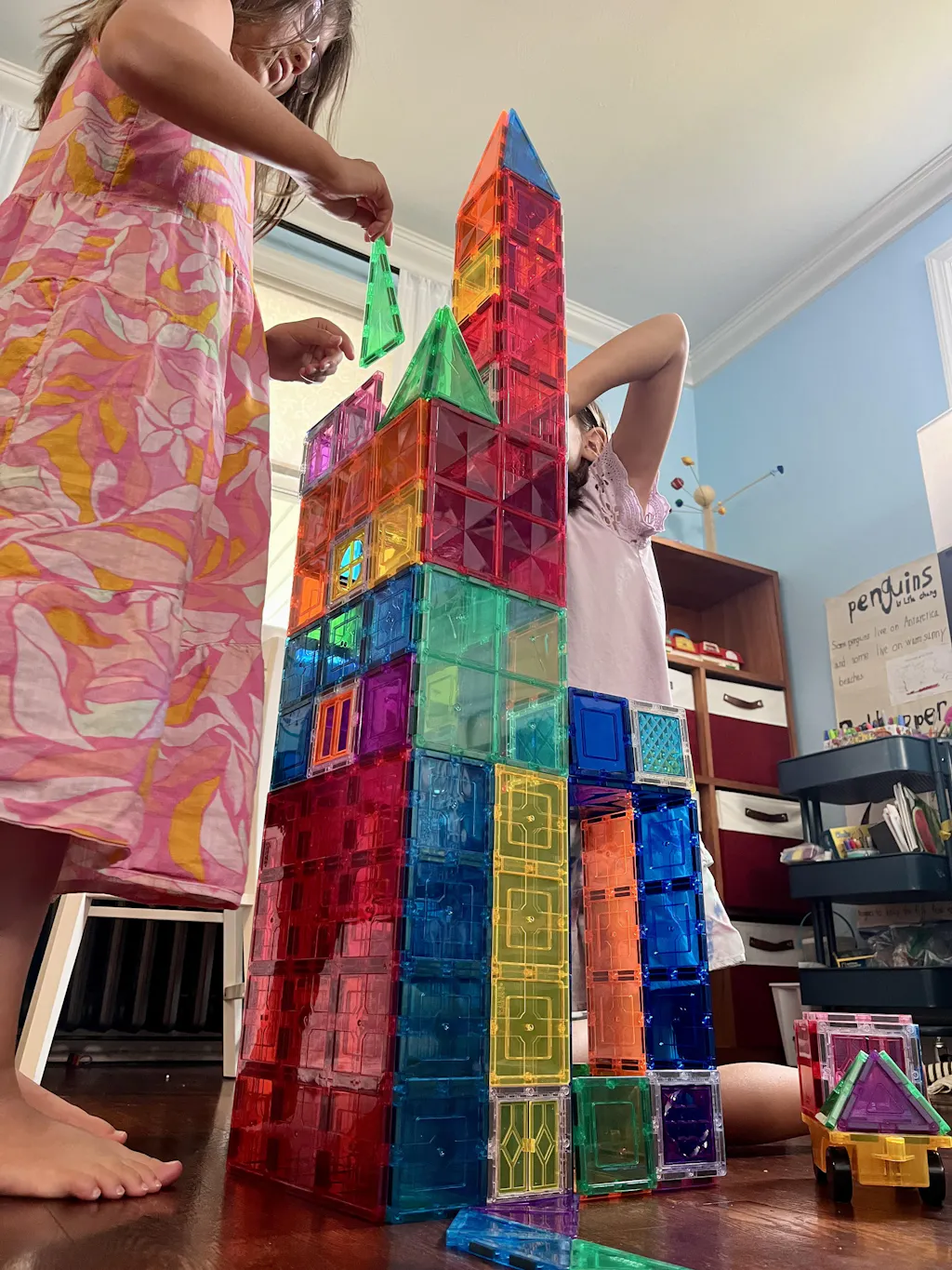 Colorful magnet tiles arranged in a tall tower structure, showcasing large foundation pieces